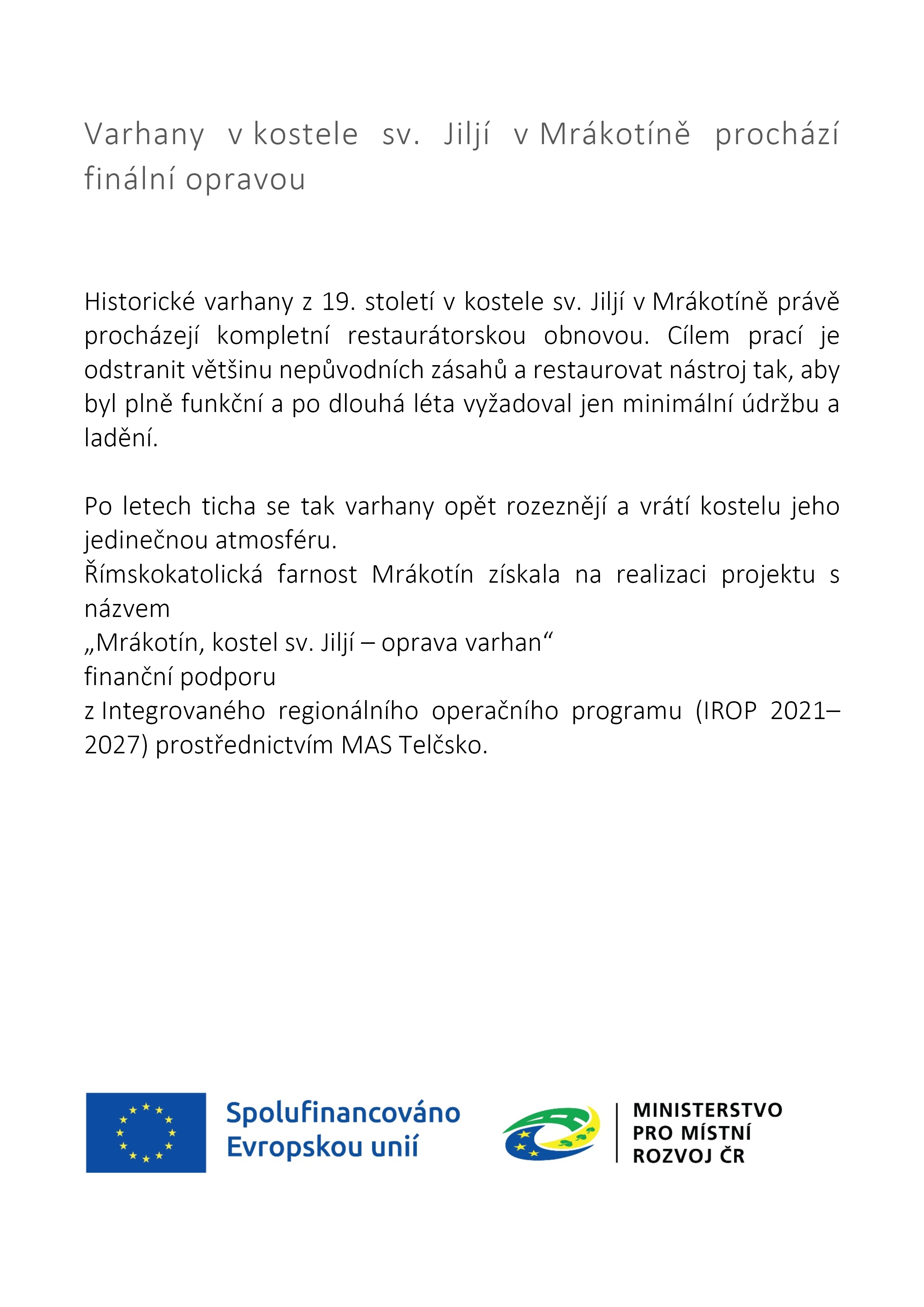 Římskokatolická farnost Mrákotín získala na realizaci projektu s názvem „Mrákotín, kostel sv. Jiljí – oprava varhan“ finanční podporu z Integrovaného regionálního operačního programu (IROP 2021-2027) prostřednictvím MAS Telčsko