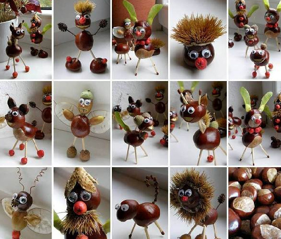 Z kaštanů, žaludů, mechu, šišek a já nevím čeho všeho ještě, však Vy jistě budete mít spoustu nápadů, si vyrobte třeba zvířátka, skřítky nebo jiné figurky. Můžete se inspirovat naším obrázkem nebo vyrábět dle vlastních nápadů a fantazie.